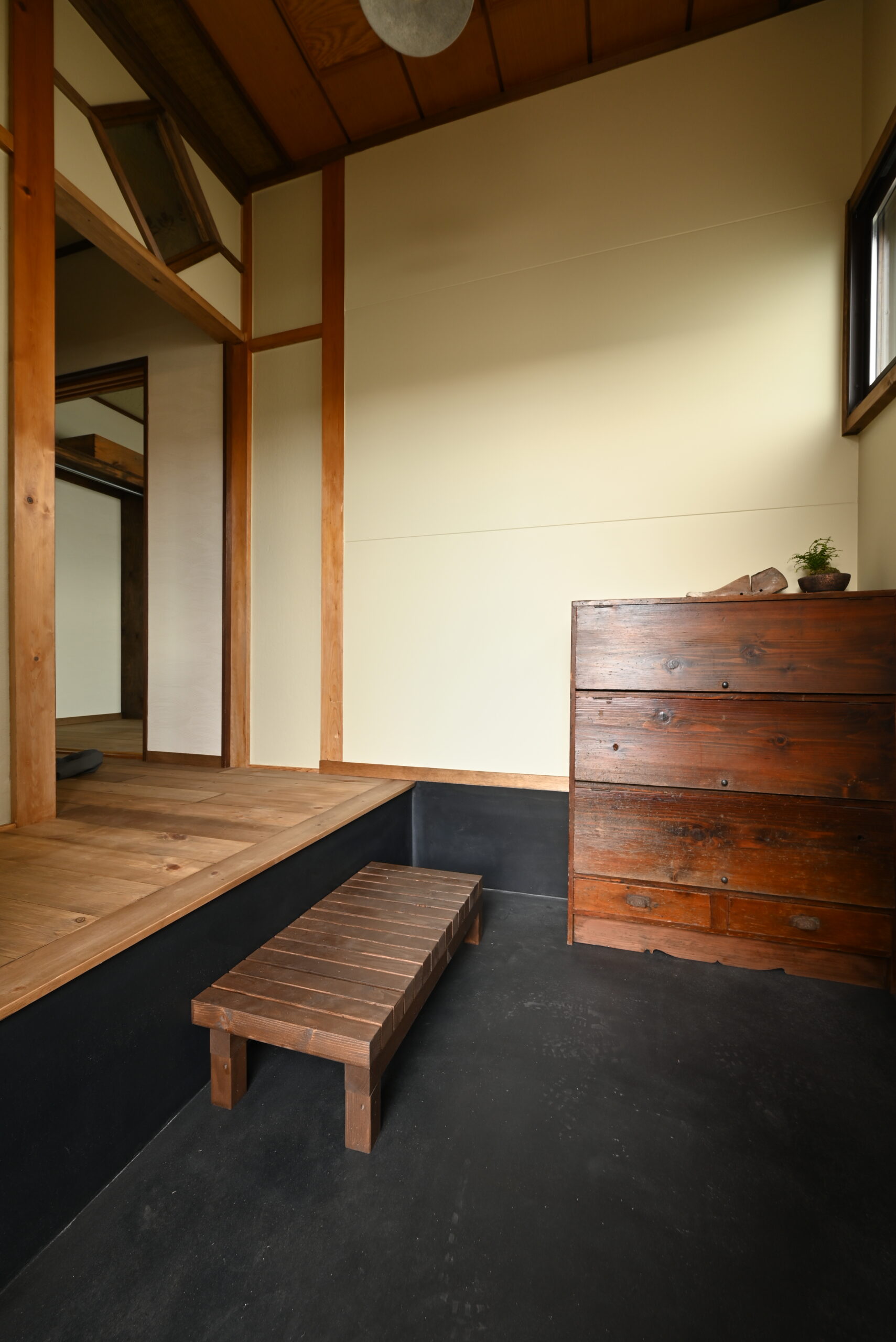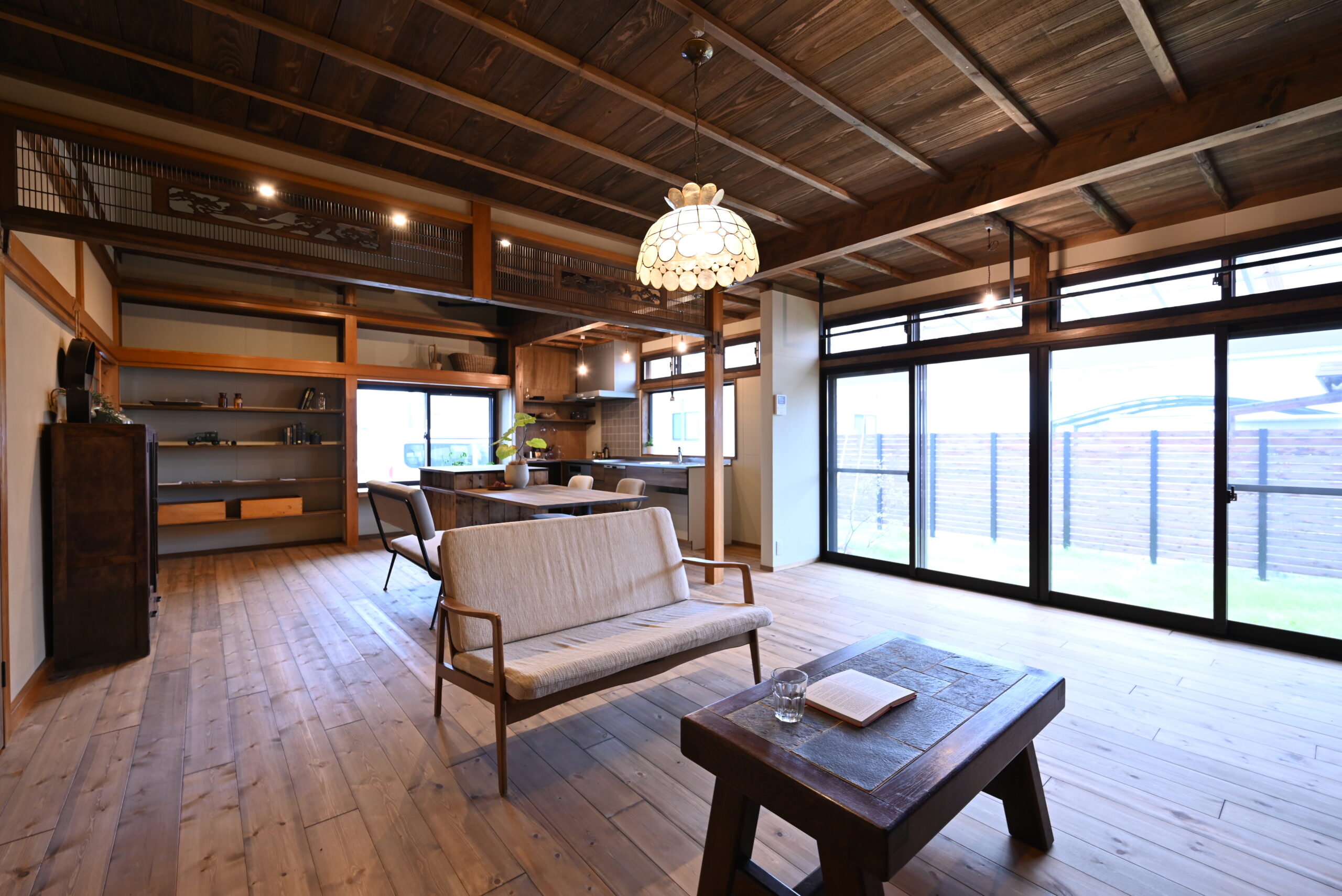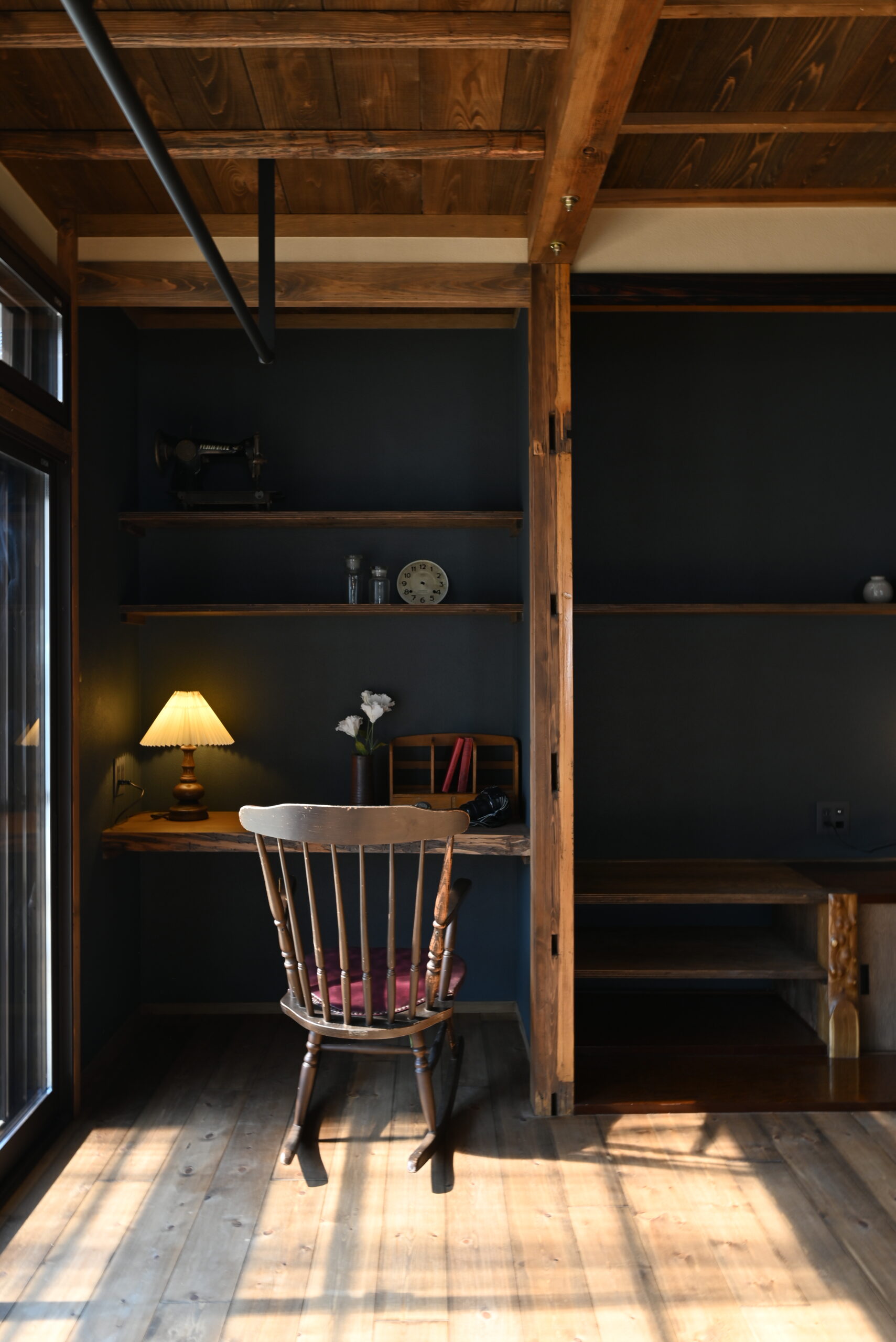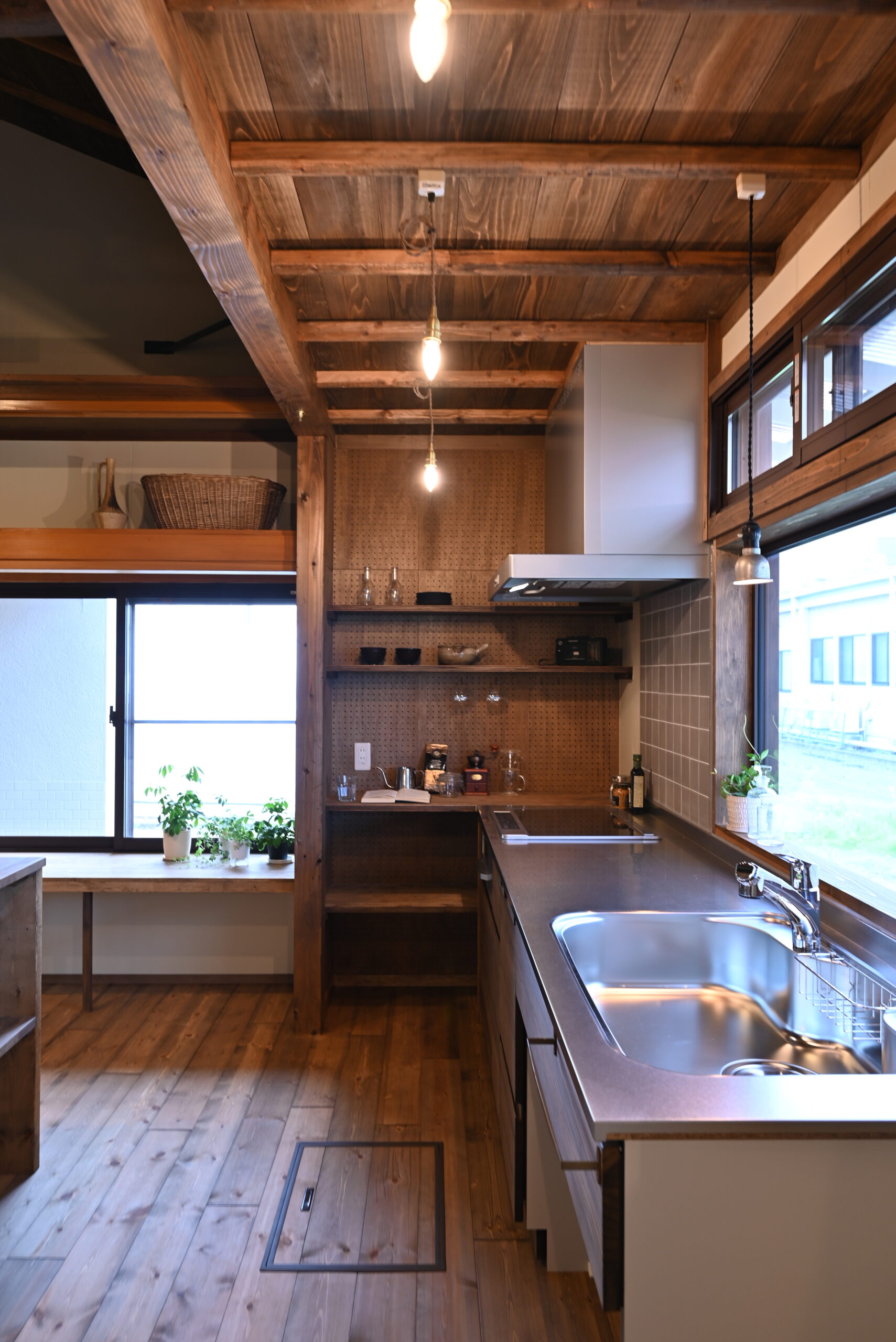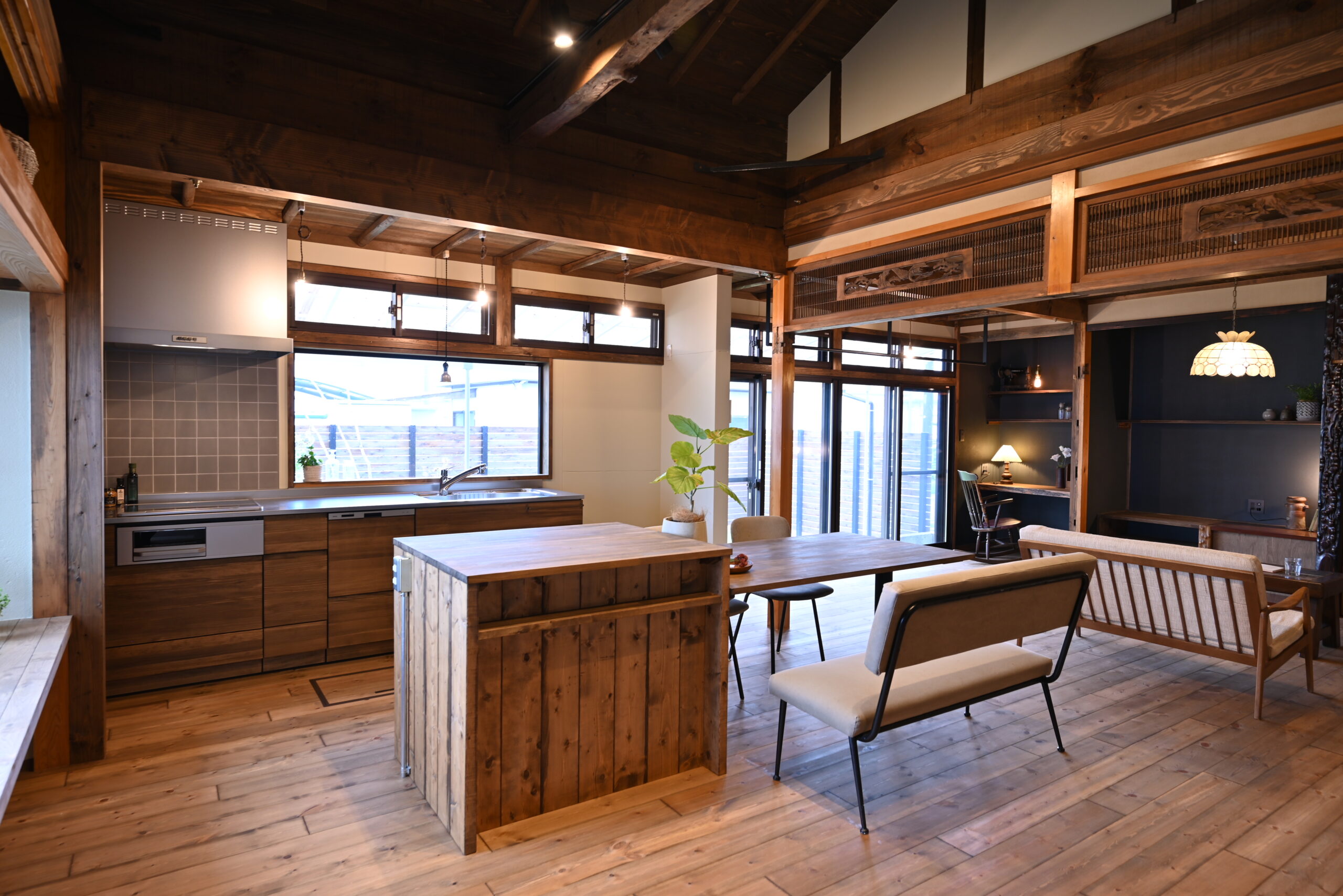 梁や木天井など、日本家屋ならではの構造を活かしながら、現代の暮らしに合うかたちへと整えた住まい。素材そのものの表情を引き立てるため、色味や仕上げは抑え、空間全体に落ち着きを持たせました。