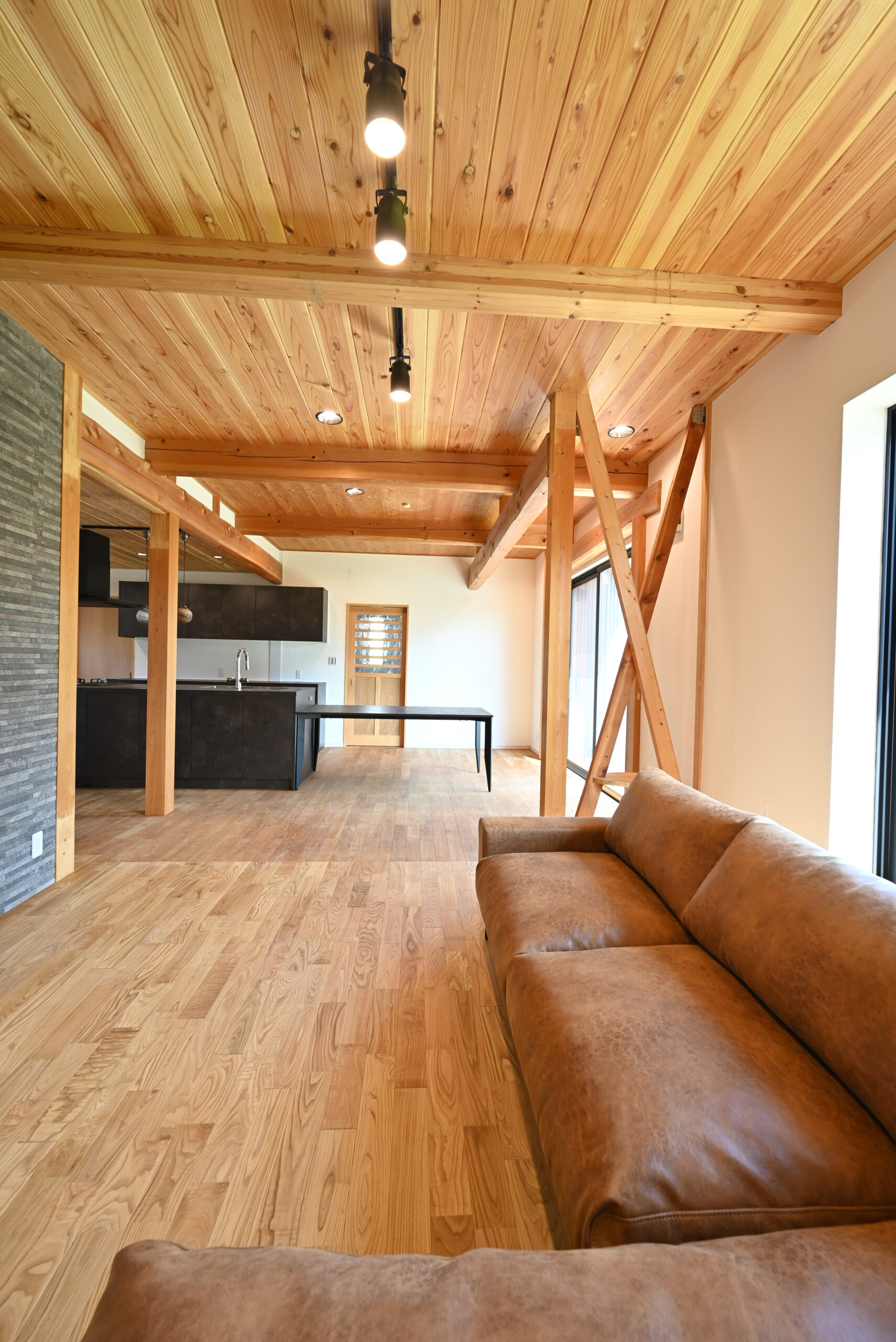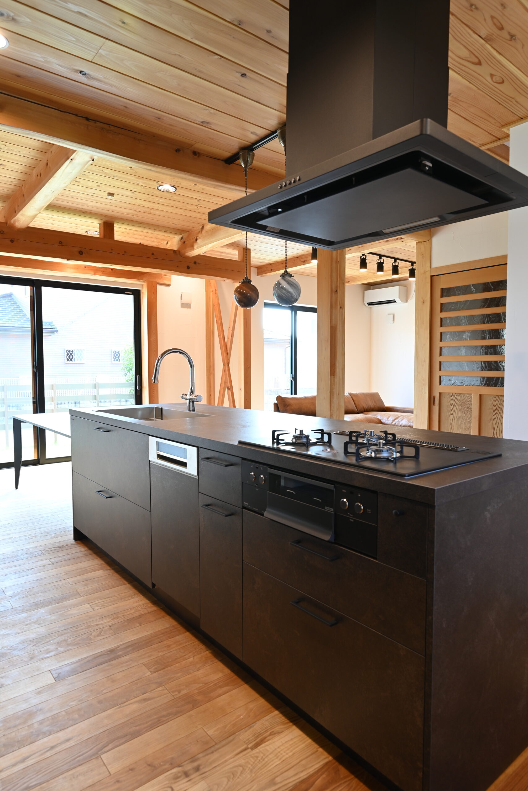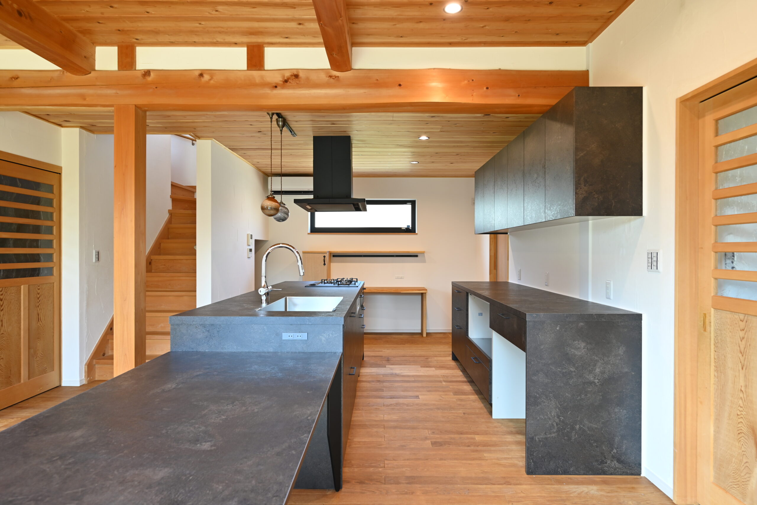 無垢材の天井や梁を現しにした、木の表情を存分に楽しめる住まい。キッチンはモノトーンでまとめ、木とのコントラストが際立つデザインに。素材感と暮らしやすさを両立した、長く愛せる一邸です。