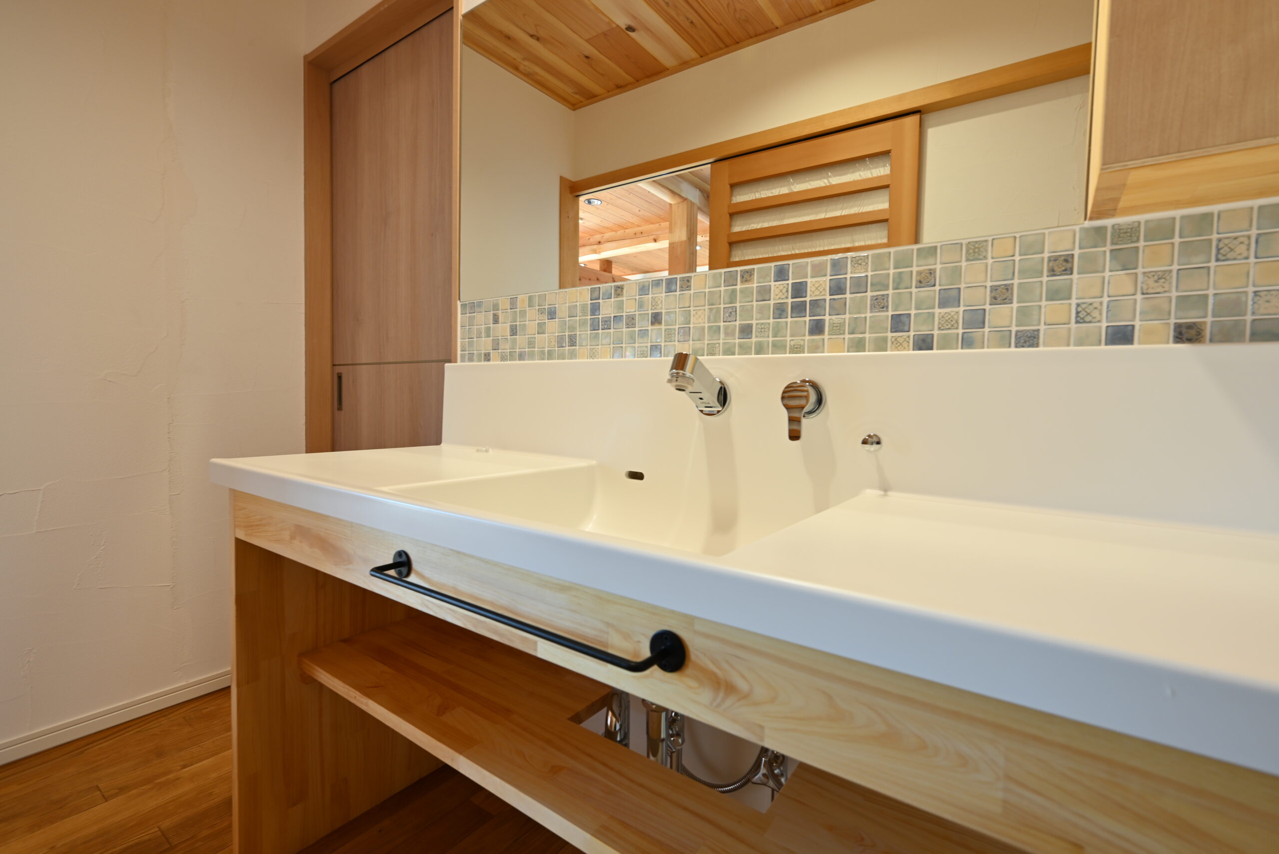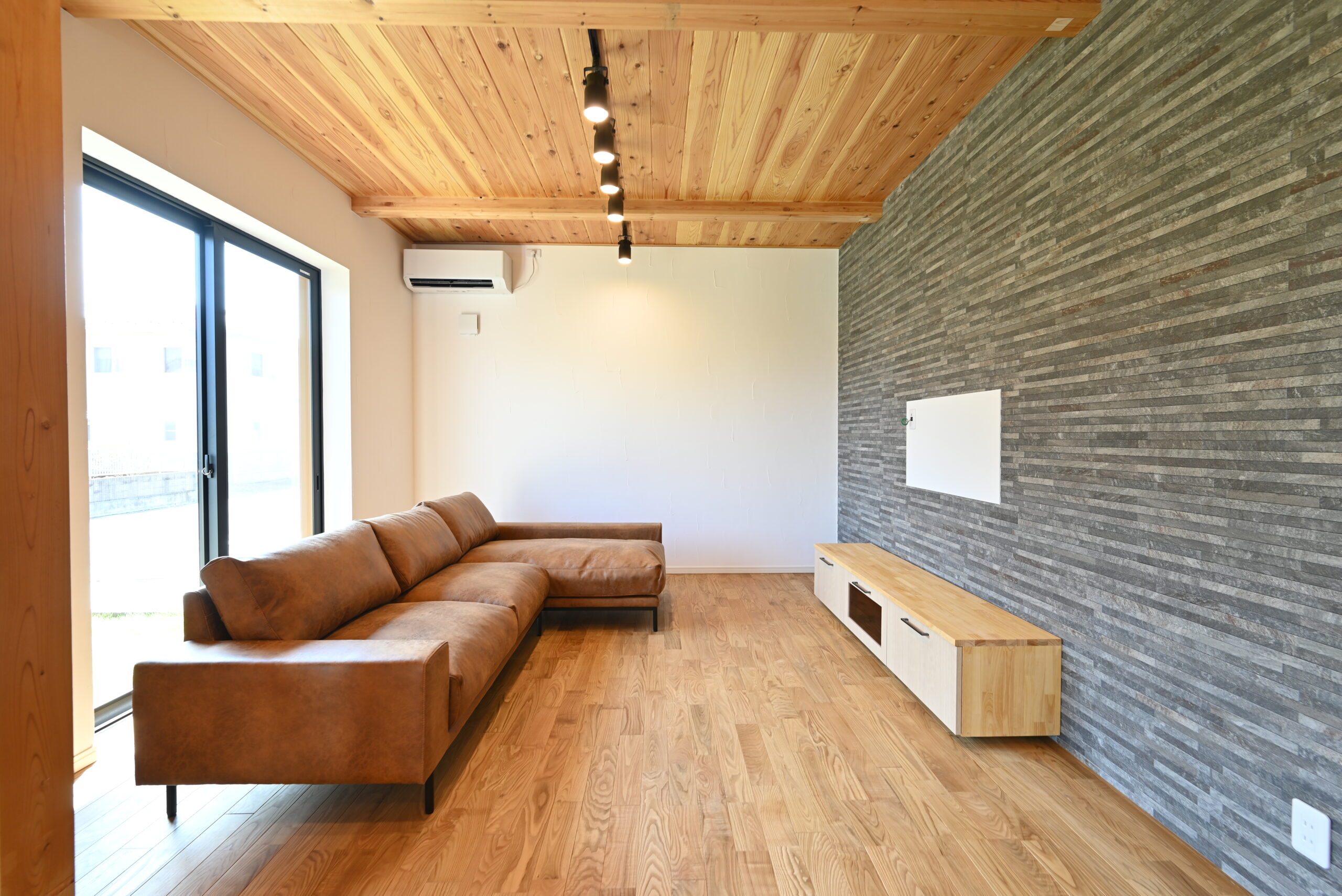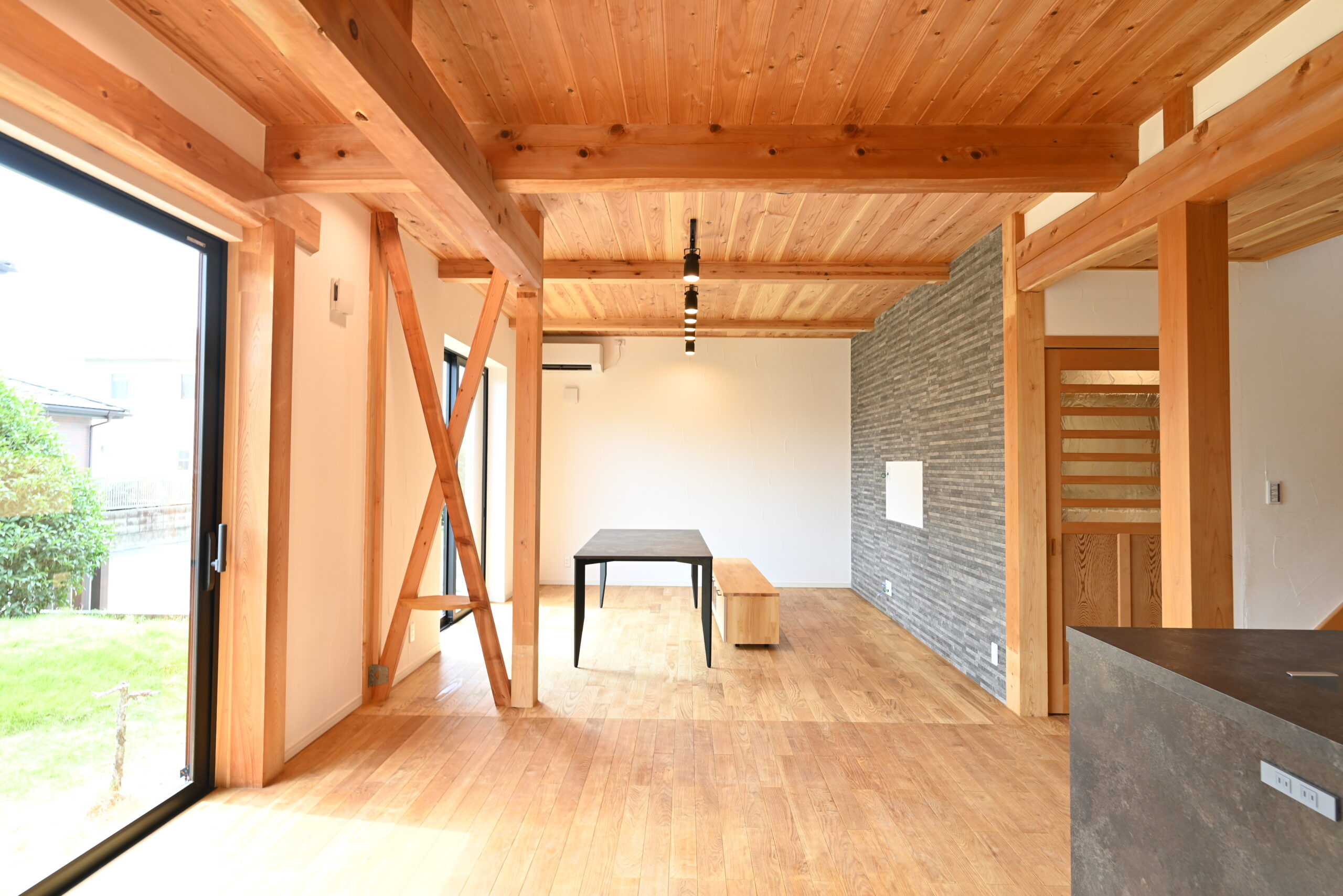 無垢材の天井や梁を現しにした、木の表情を存分に楽しめる住まい。キッチンはモノトーンでまとめ、木とのコントラストが際立つデザインに。素材感と暮らしやすさを両立した、長く愛せる一邸です。