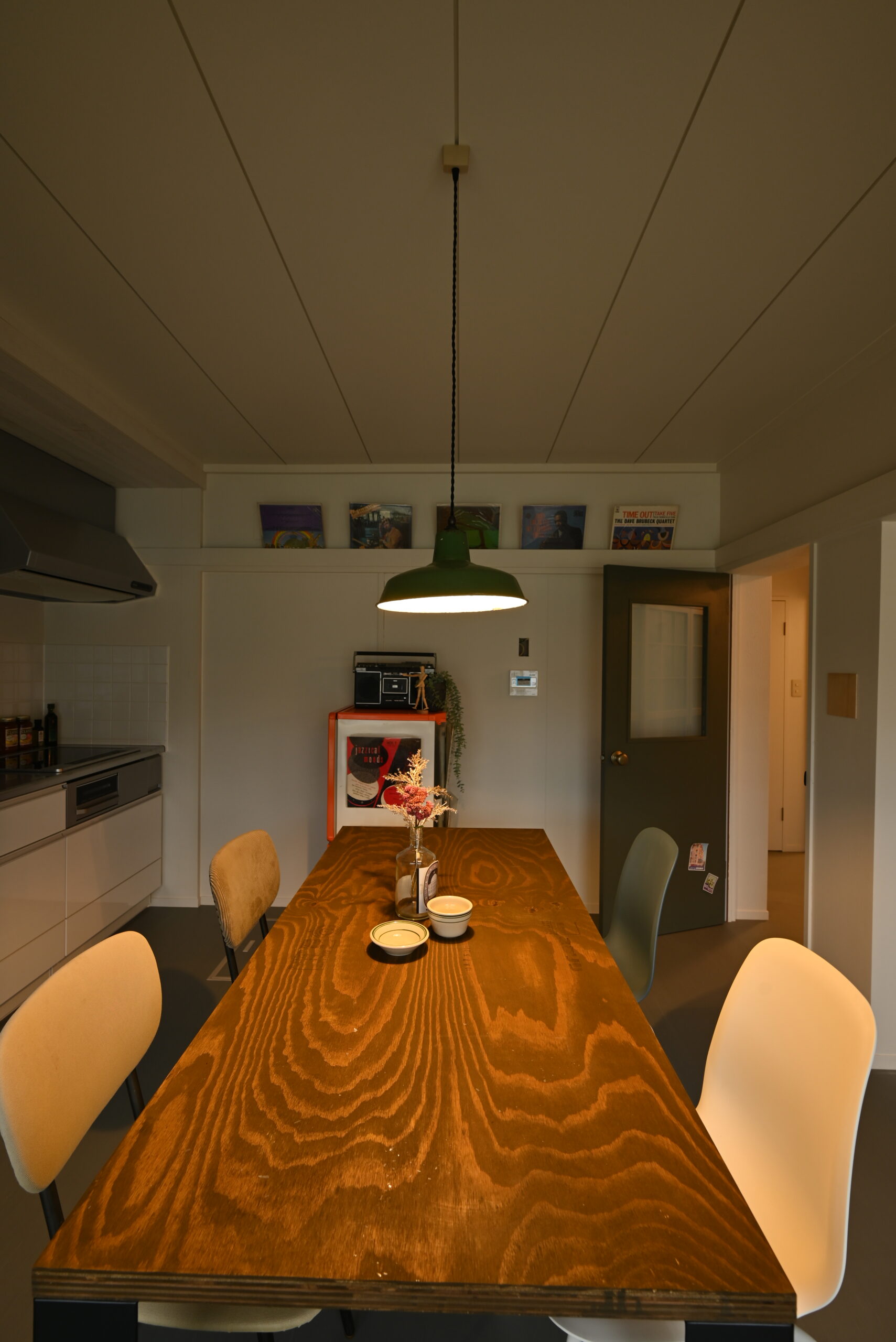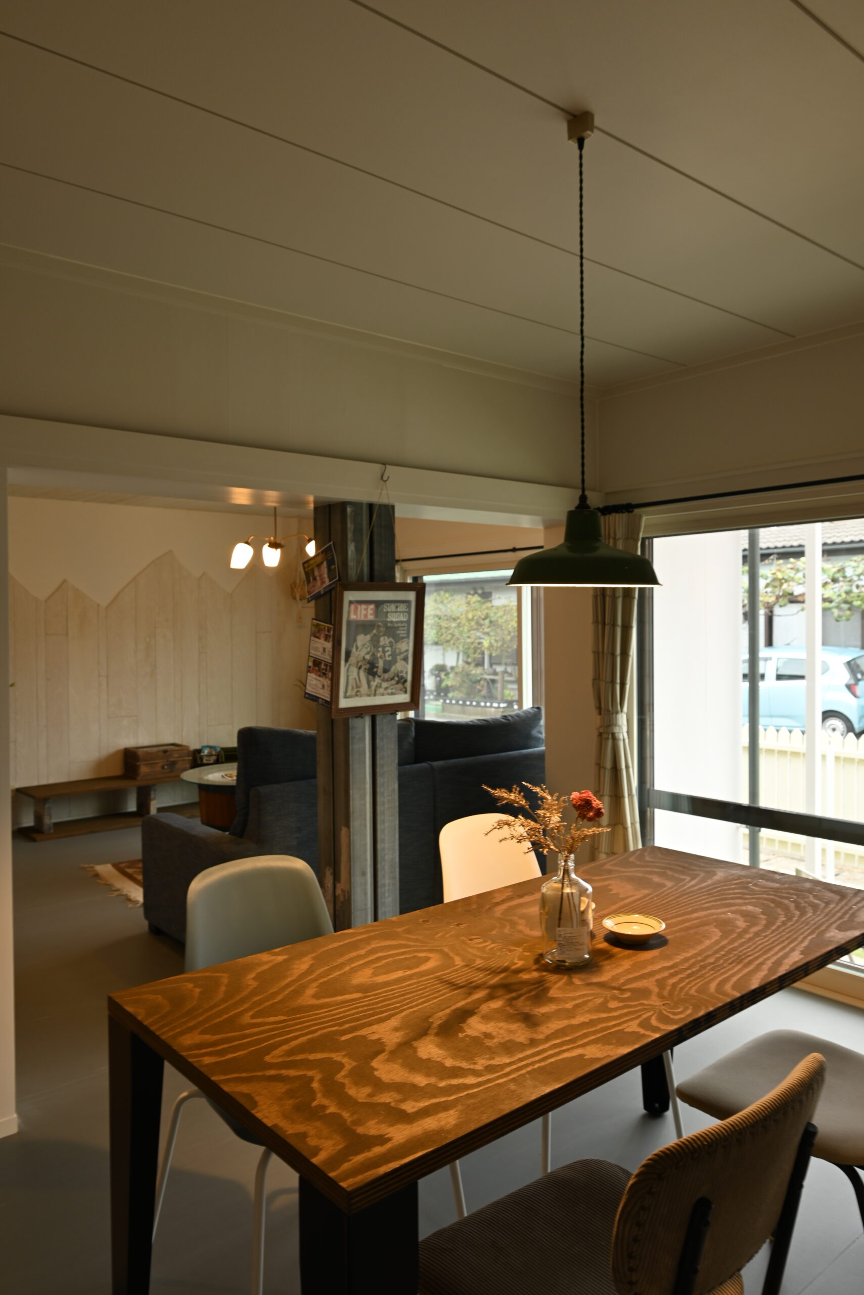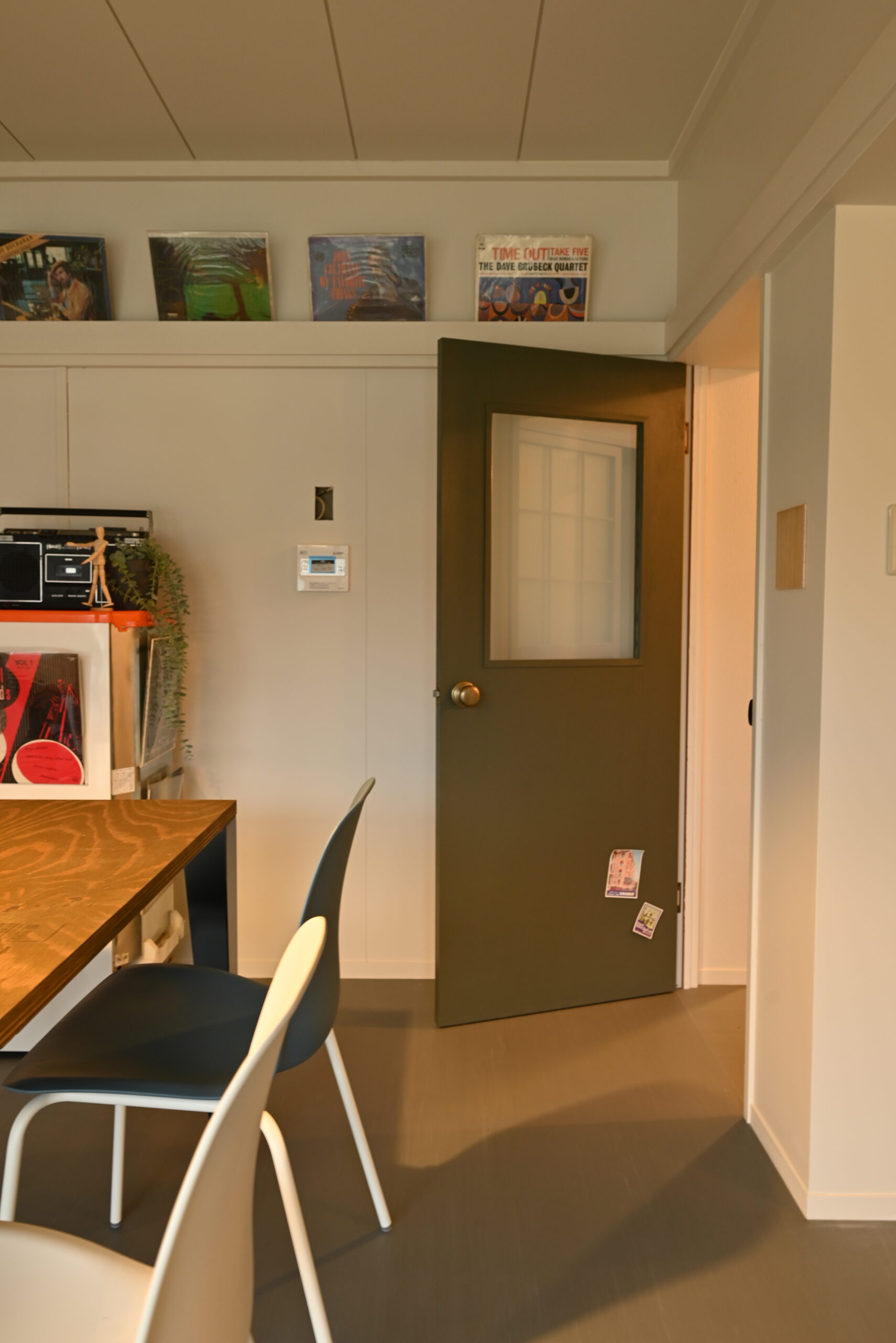 オリーブグリーンのドアやインダストリアルな照明、木目の力強いダイニングテーブルが、タフで落ち着いた空間を演出。