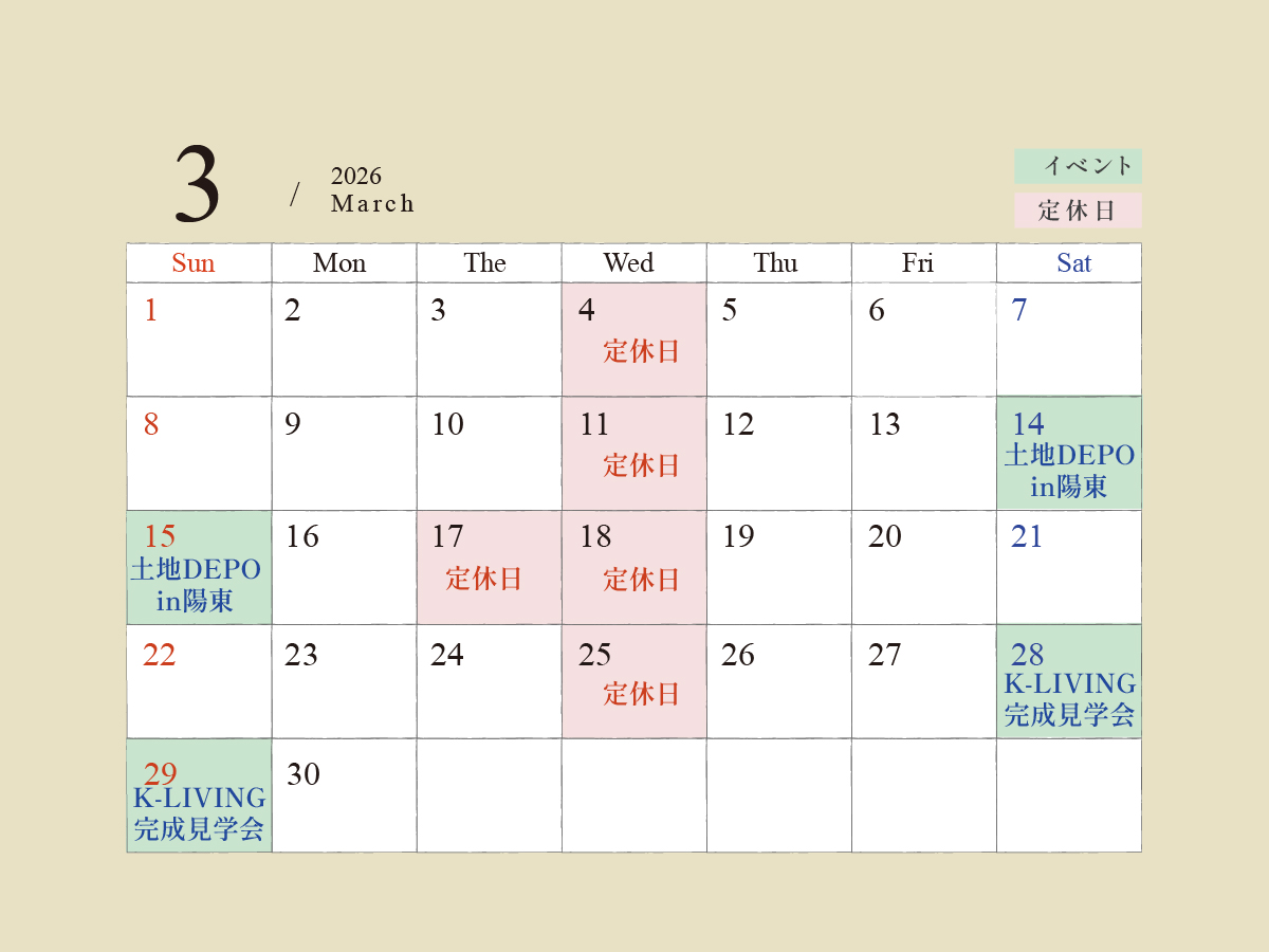 2026年3月営業日のお知らせです。
