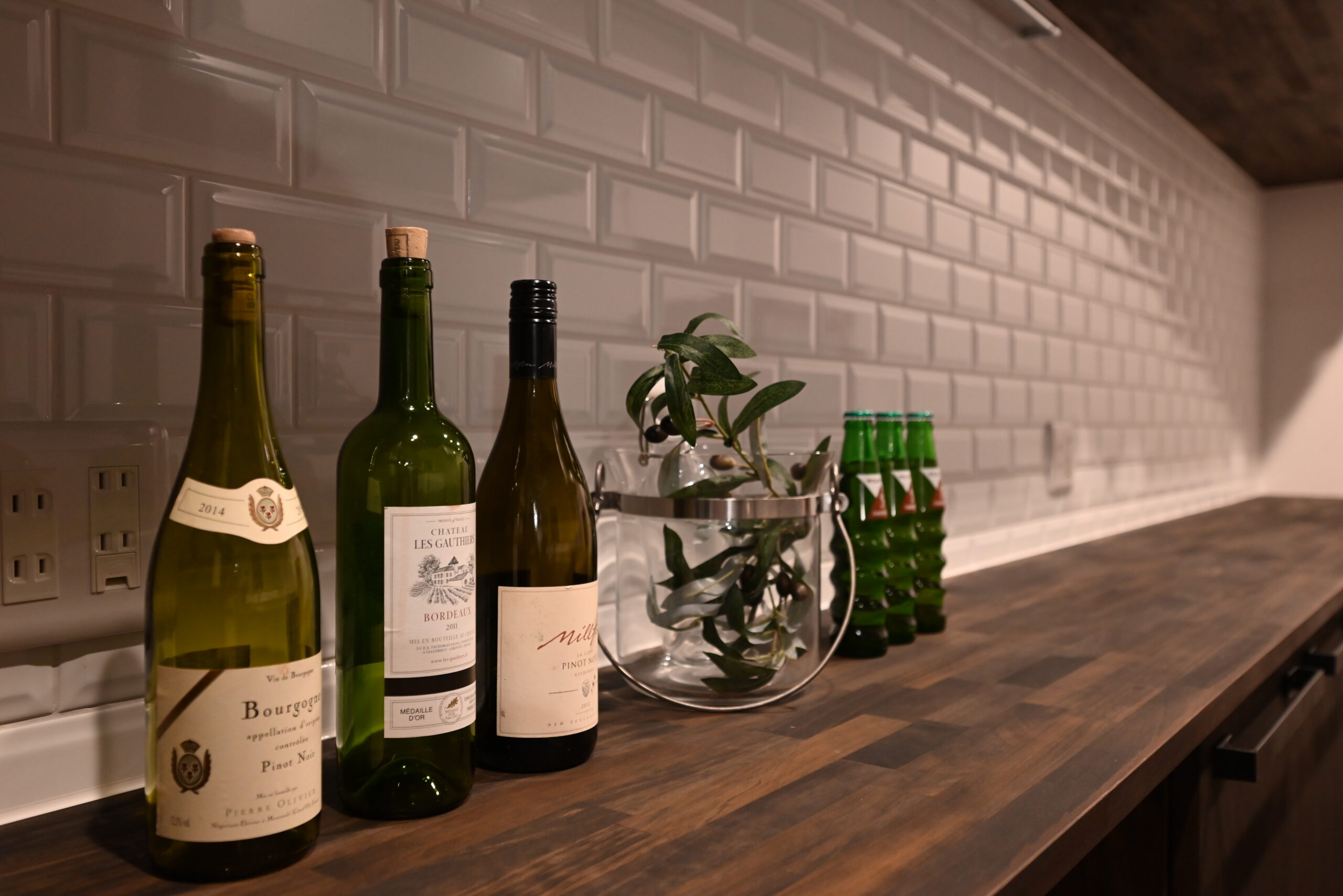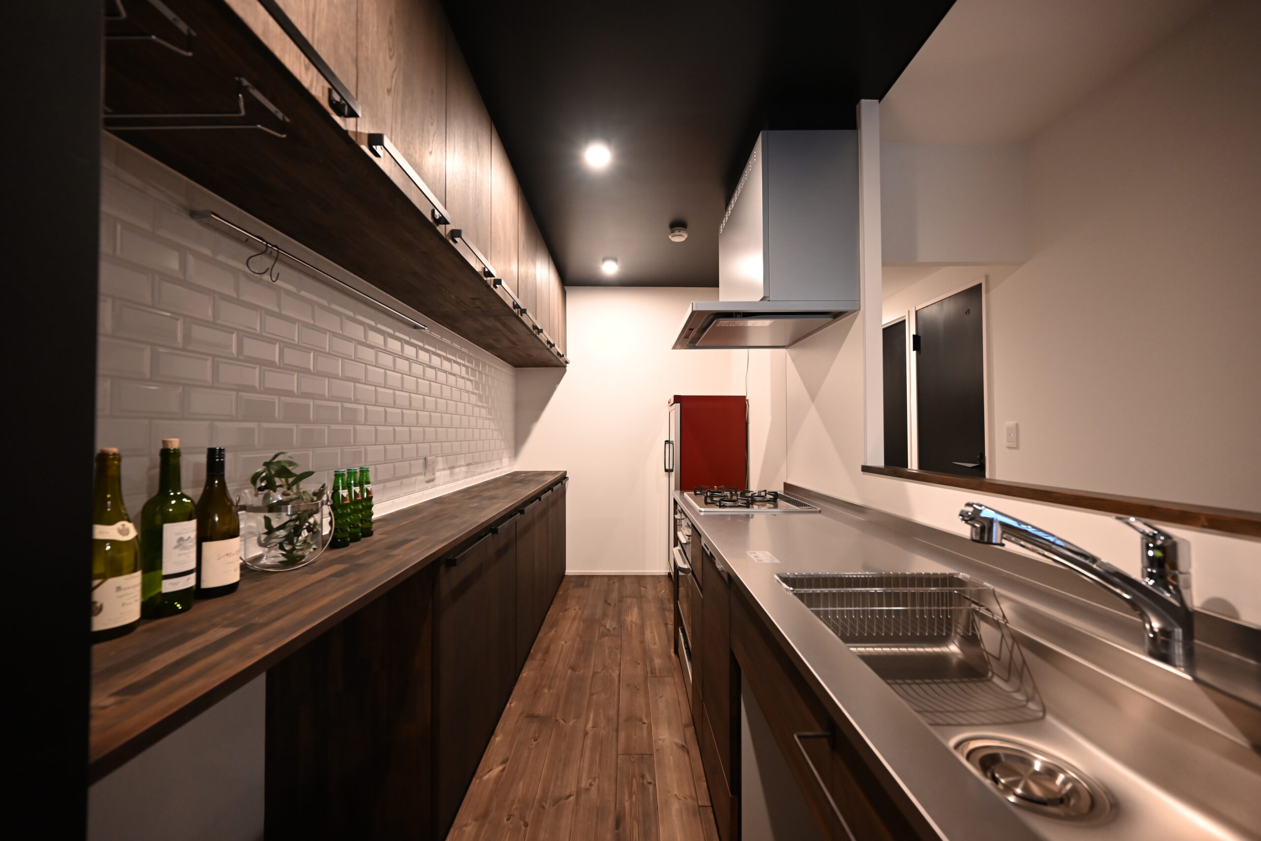 キッチンには白いサブウェイタイルをあしらい、ステンレスの質感と木の温もりが融合したスタイリッシュな空間に仕上げました。