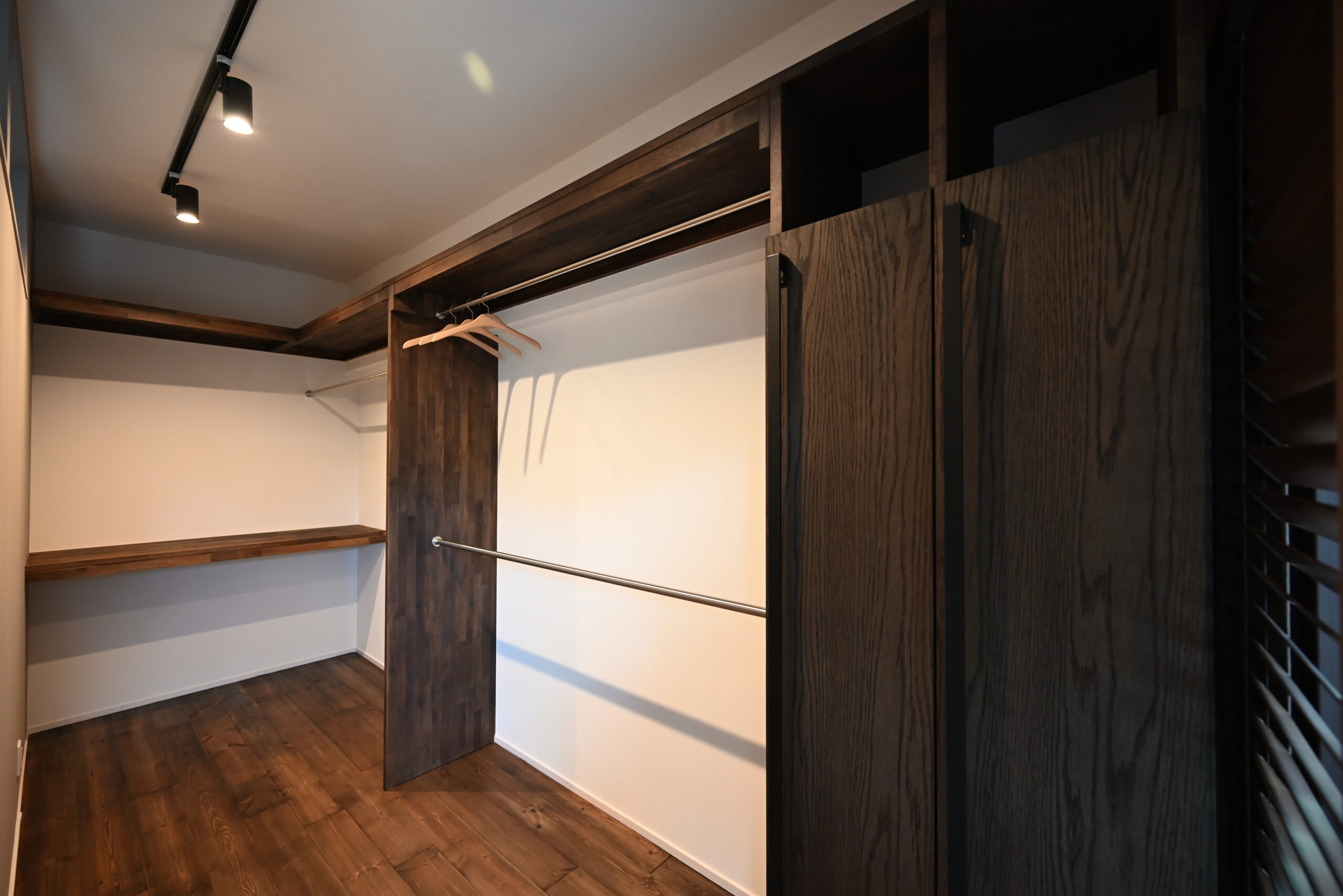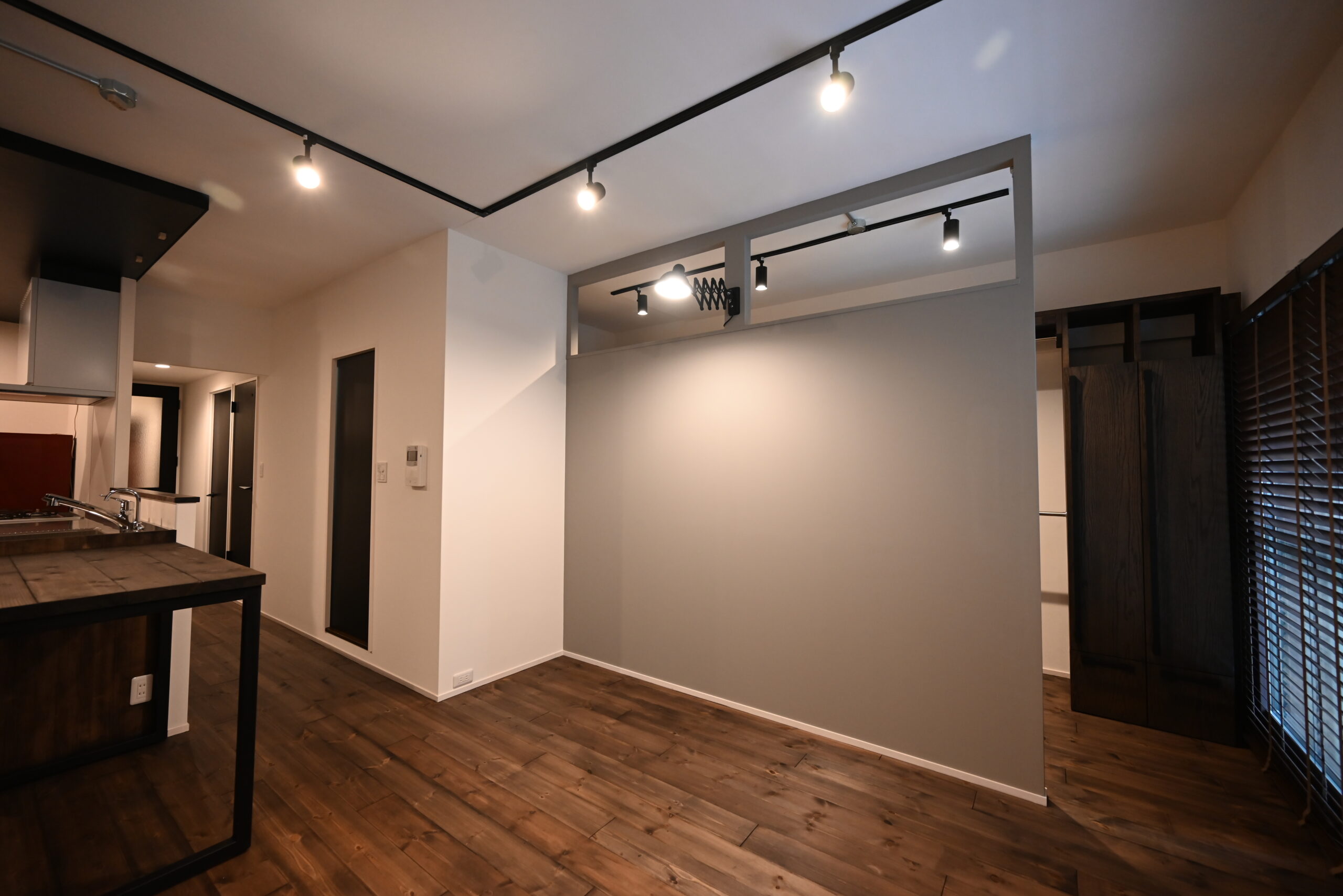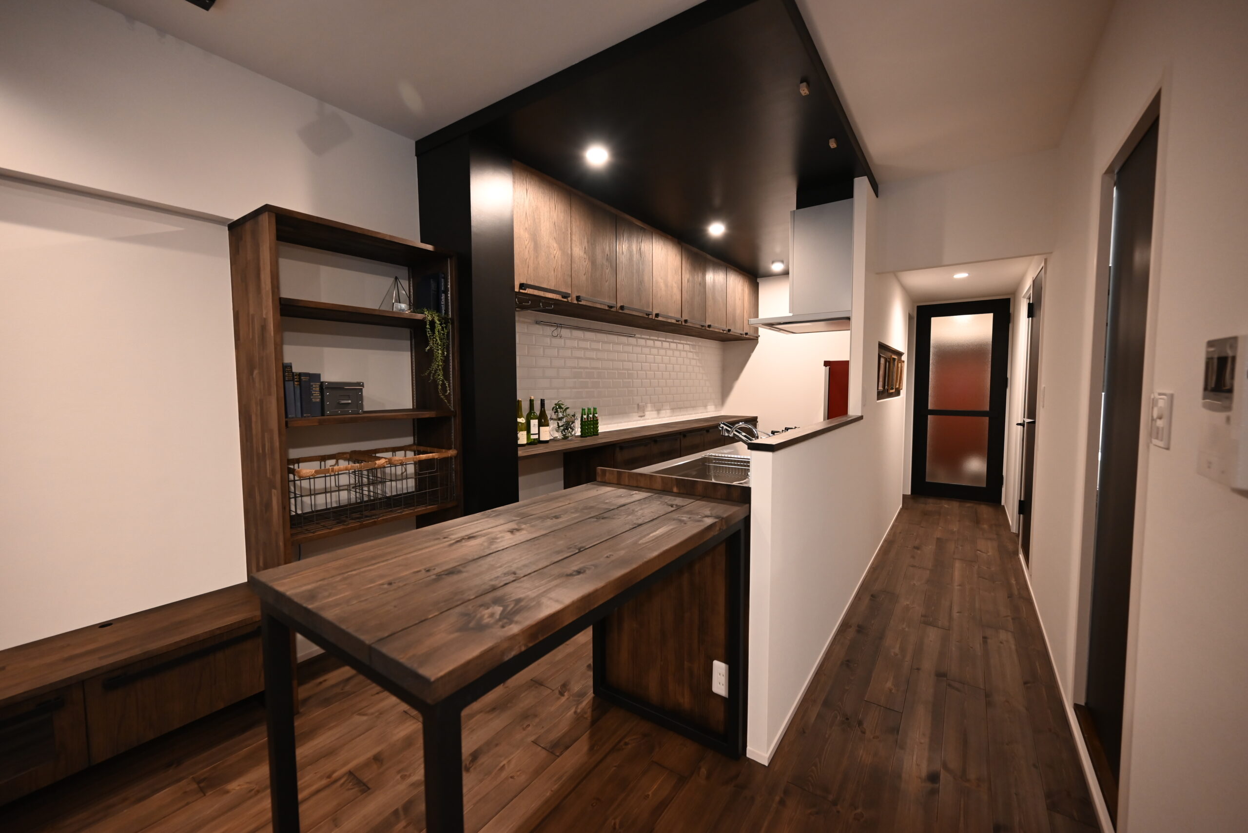 落ち着いたダークトーンの無垢床と、モノトーンが調和するヴィンテージモダンな空間。