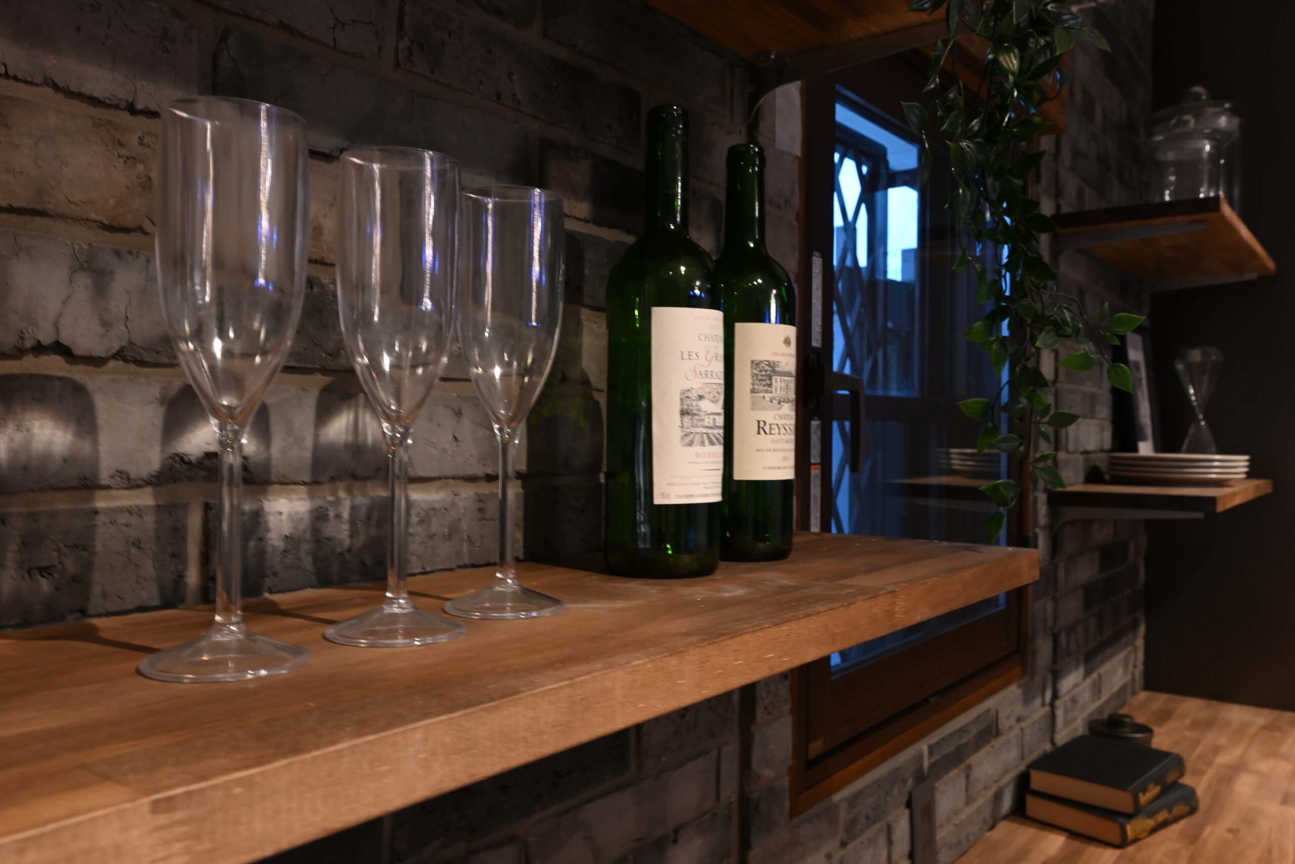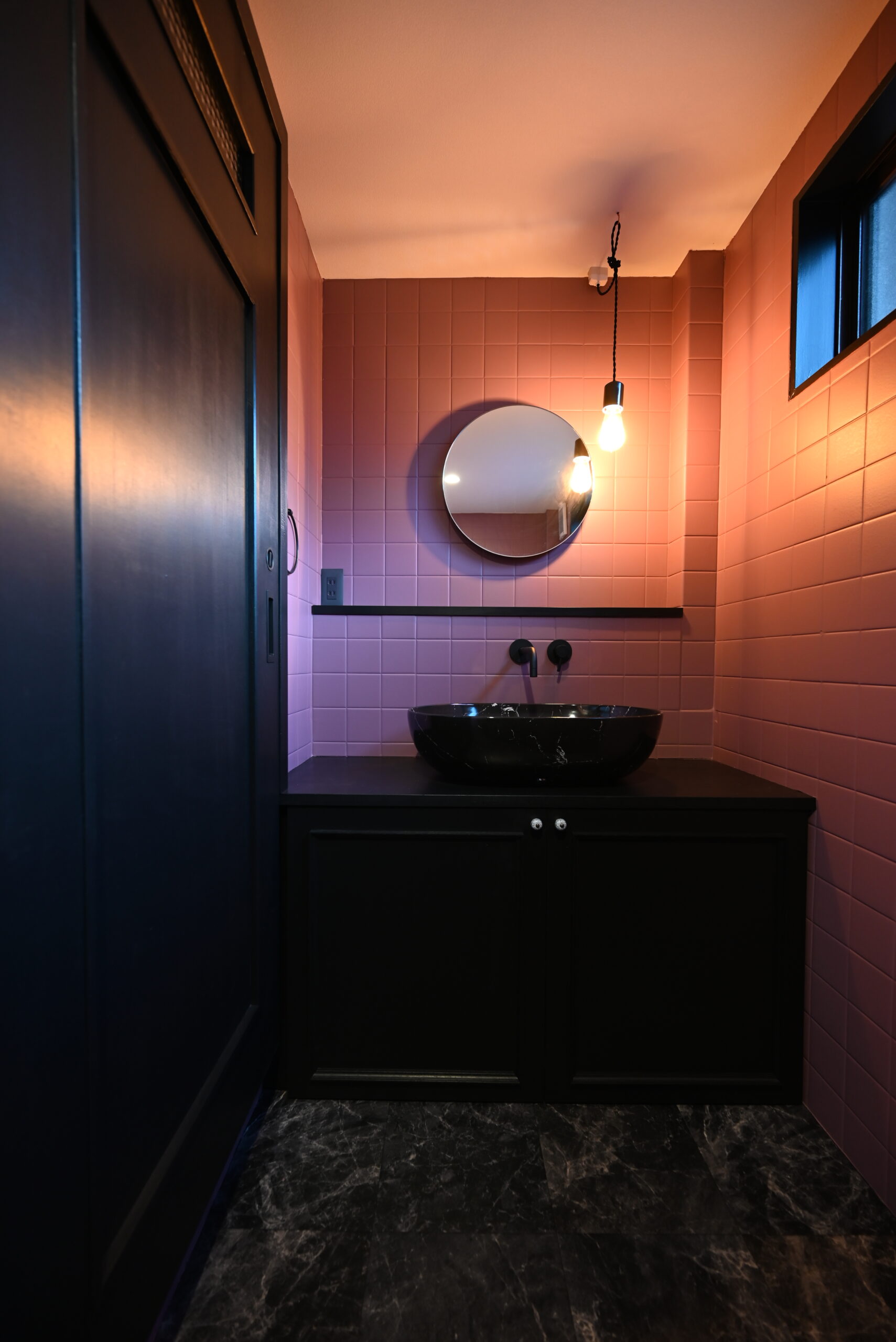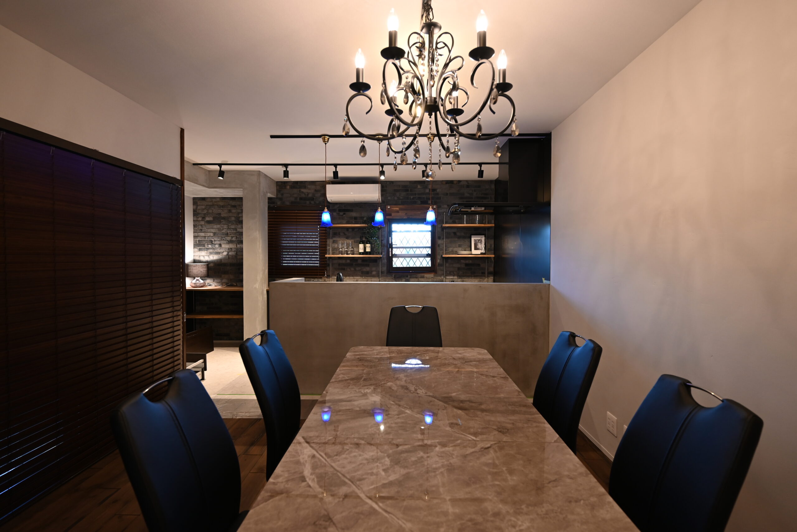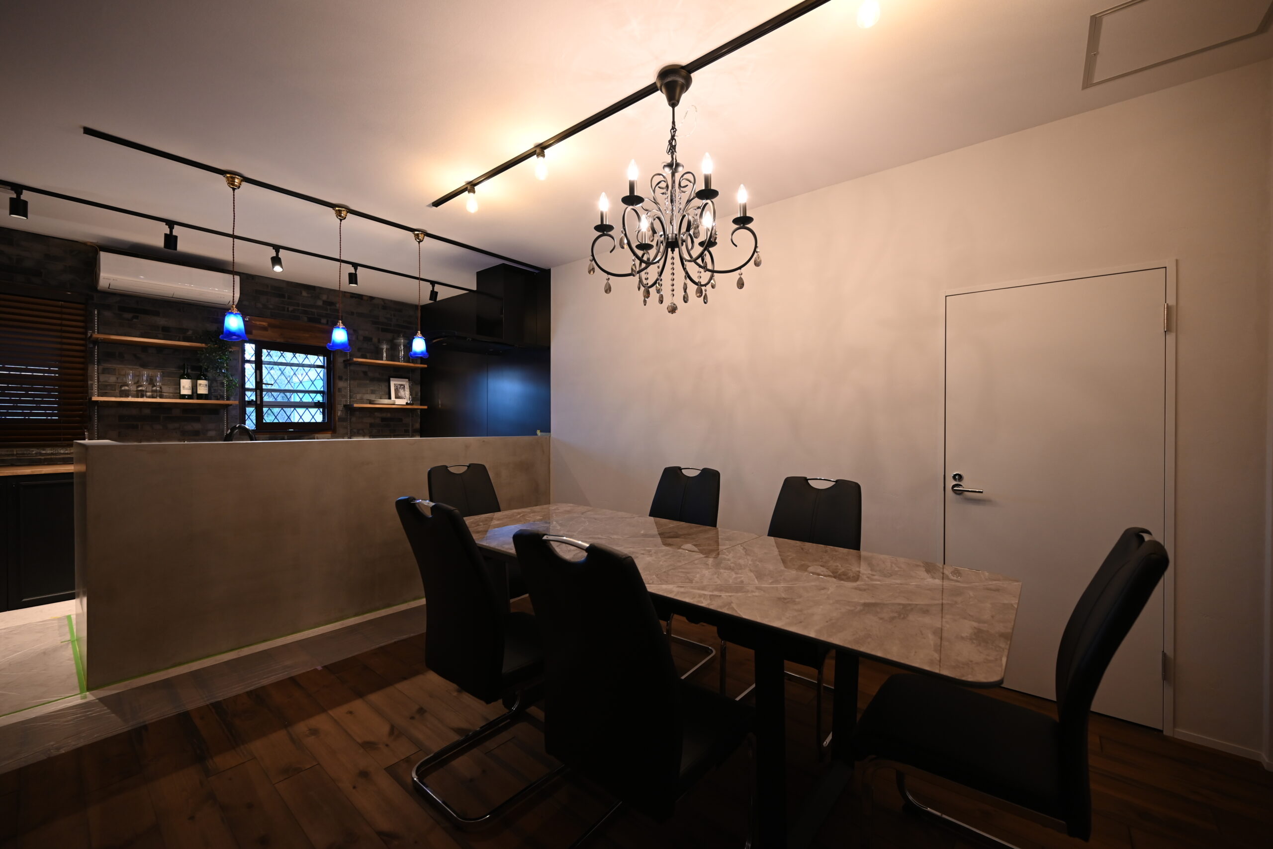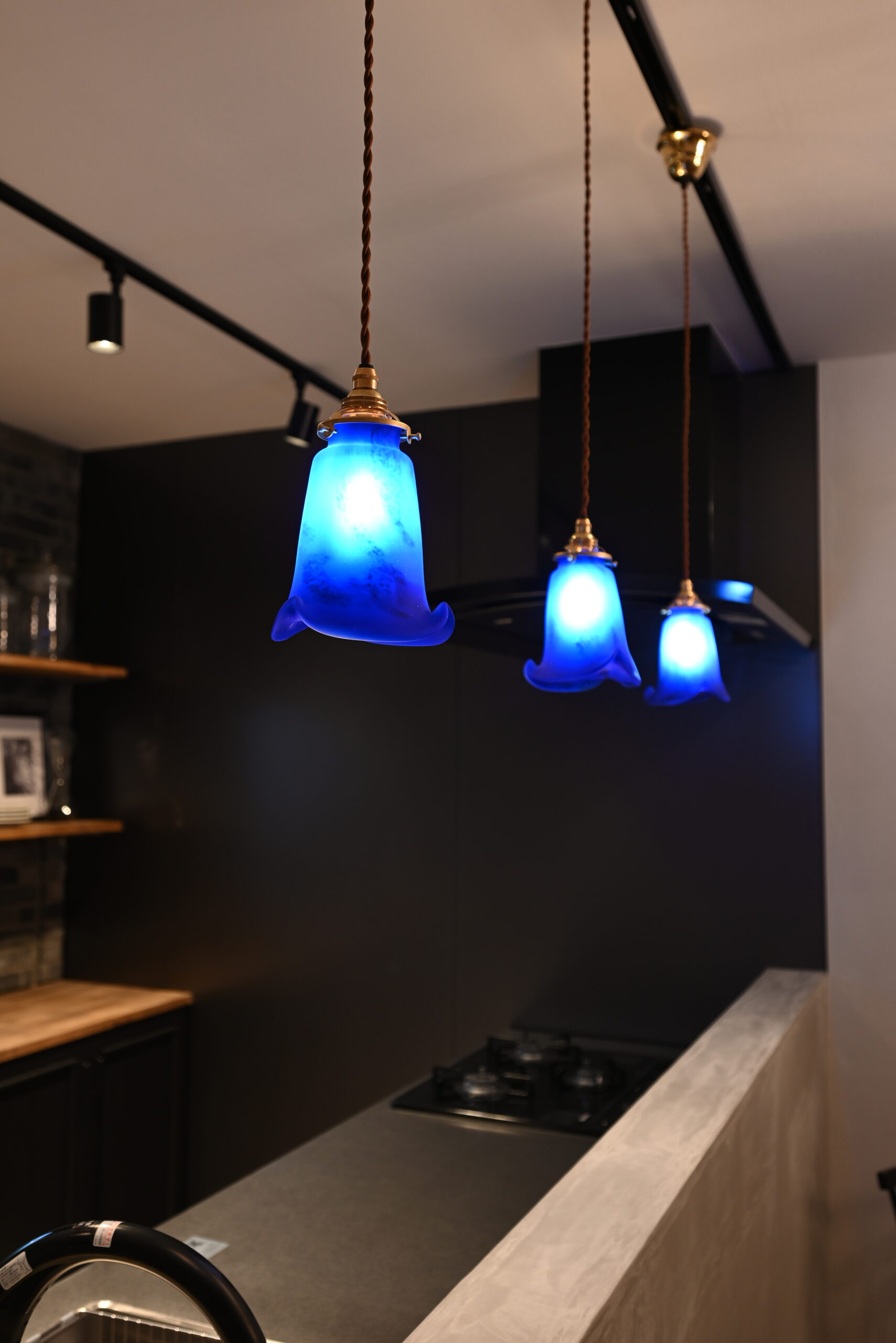 黒を基調としたシックな空間に、鮮やかなブルーのペンダントライトが幻想的なアクセントに。キッチンはコンクリート調の腰壁やレンガタイル風の壁面を組み合わせ、無骨ながらも洗練されたインダストリアルな装いに仕上げました。住む人のこだわりを細部まで形にした一邸です。