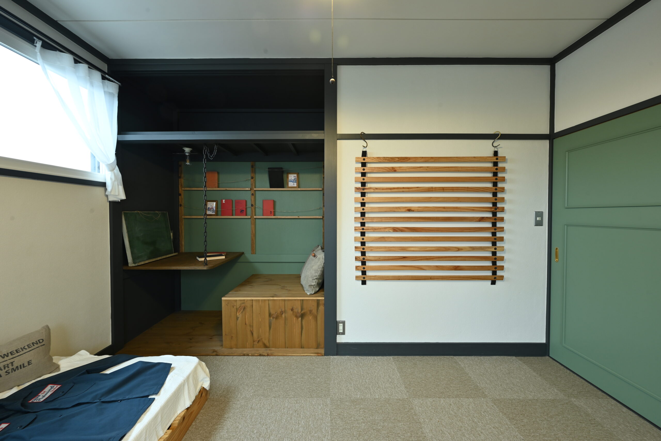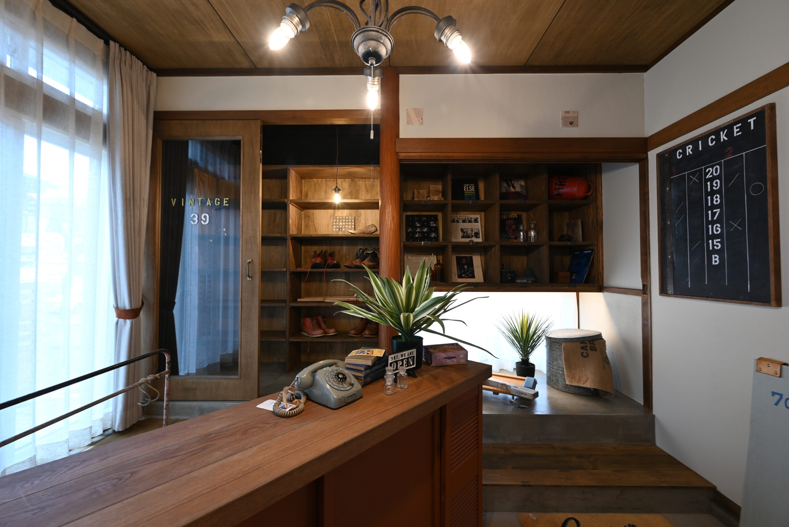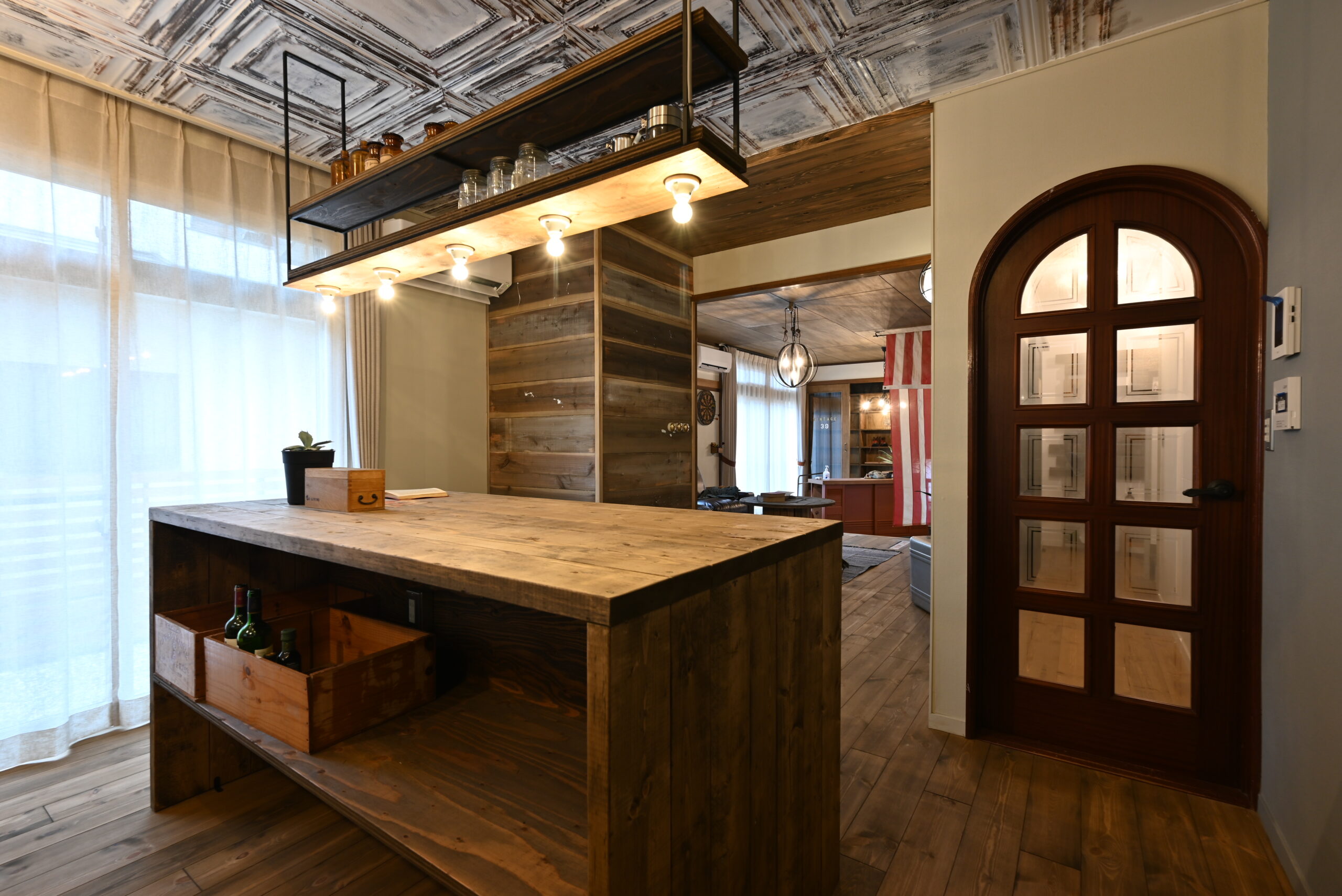エイジング加工の木材やティンパネル天井が印象的な、アメリカンヴィンテージな空間。玄関には愛用の靴を飾るショップ風の棚を造作し、趣味を楽しむ「大人の秘密基地」を表現しました。サブウェイタイルや幾何学模様の床など、細部までこだわりと遊び心を詰め込んだリノベーションです。