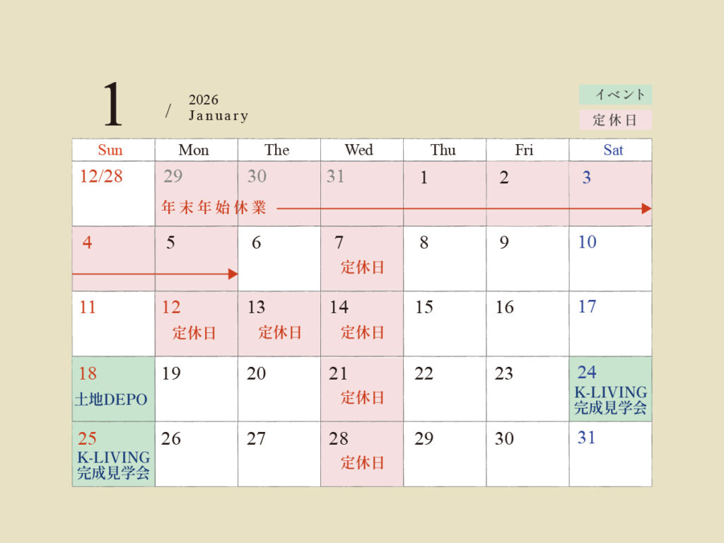 Blog 2025年1月K-LIVINGイベント&定休日のお知らせです。 ●月1回の火曜定休日は1/14(火)となります。 ●1/28(火)~30(木)は社員研修のため臨時休業となります。 ~年末年始休業のお知らせ~ 2 […]